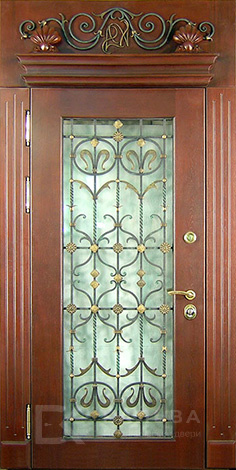 Фото «Стальная двустворчатая дверь под орех со стеклом и ковкой №105»